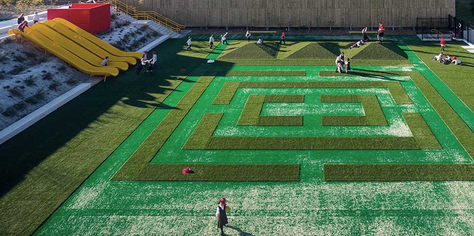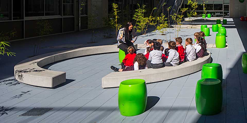 The new building is located on the footprint of the former Anzac Club building, with the existing bowling greens and games courts recycled as the school’s open play space. A number of innovative design strategies were employed to address the challenges presented by a brief for a large school population on a compact site, and to maximise opportunities for outdoor play and learning. These strategies included: